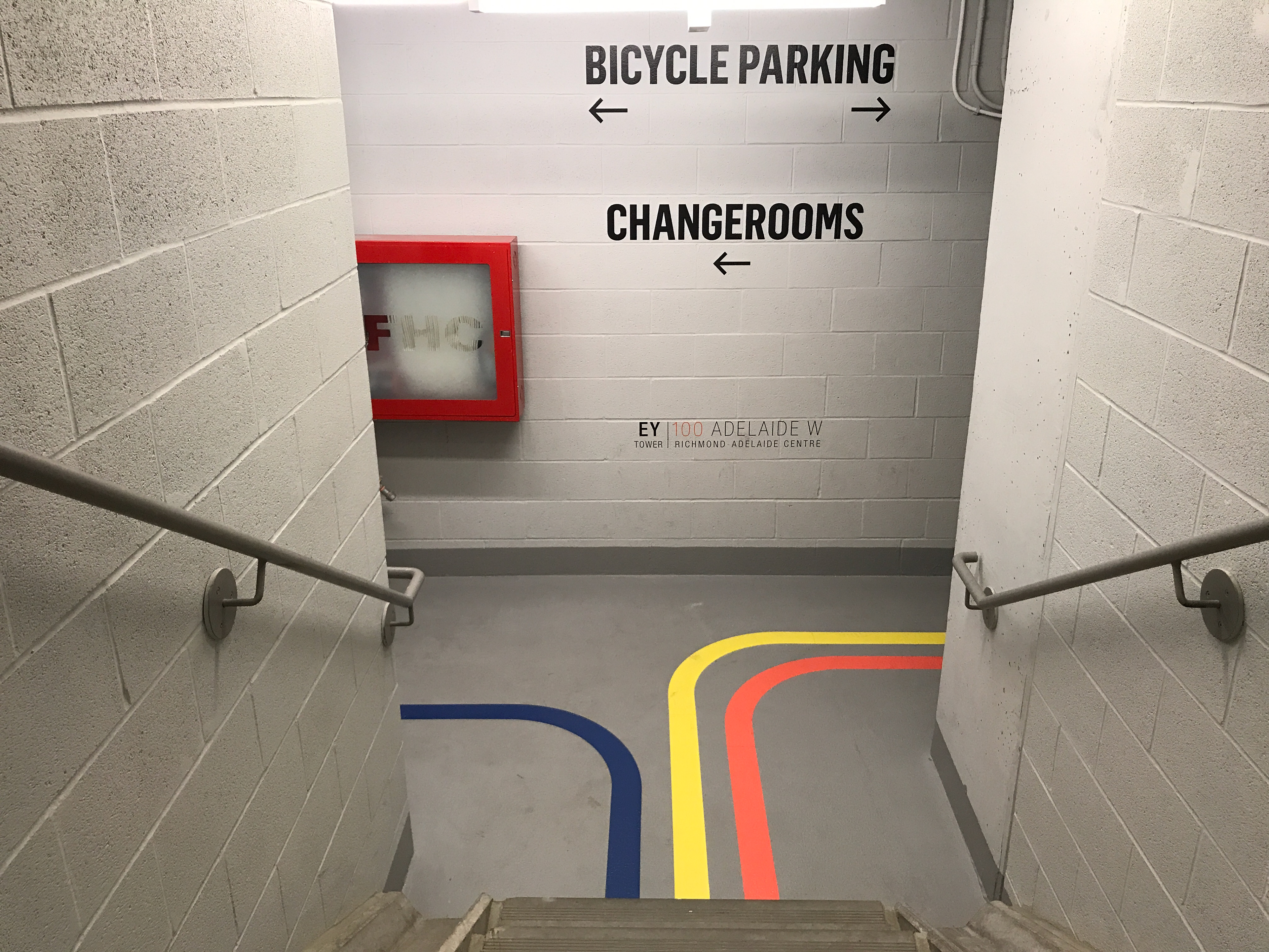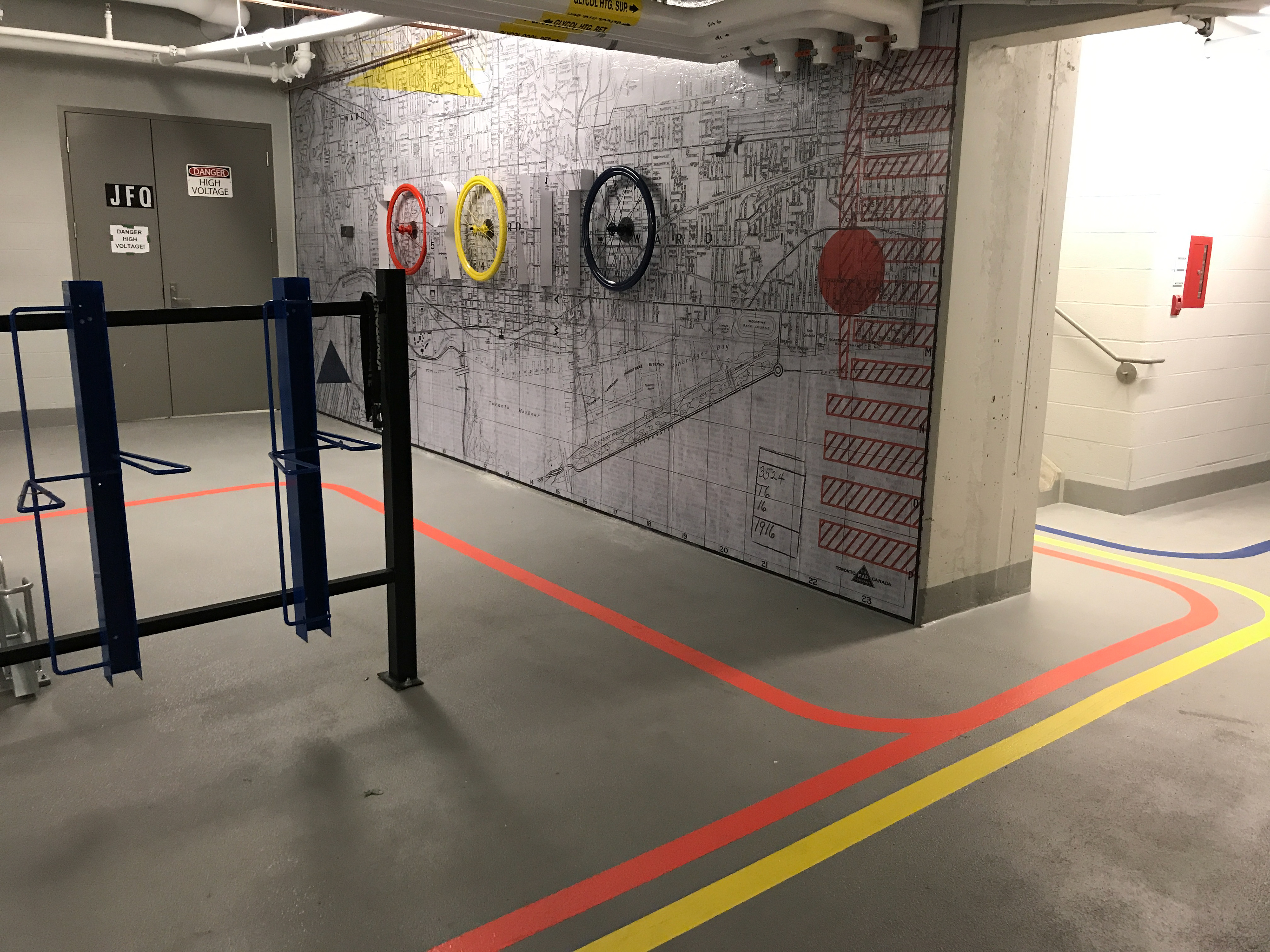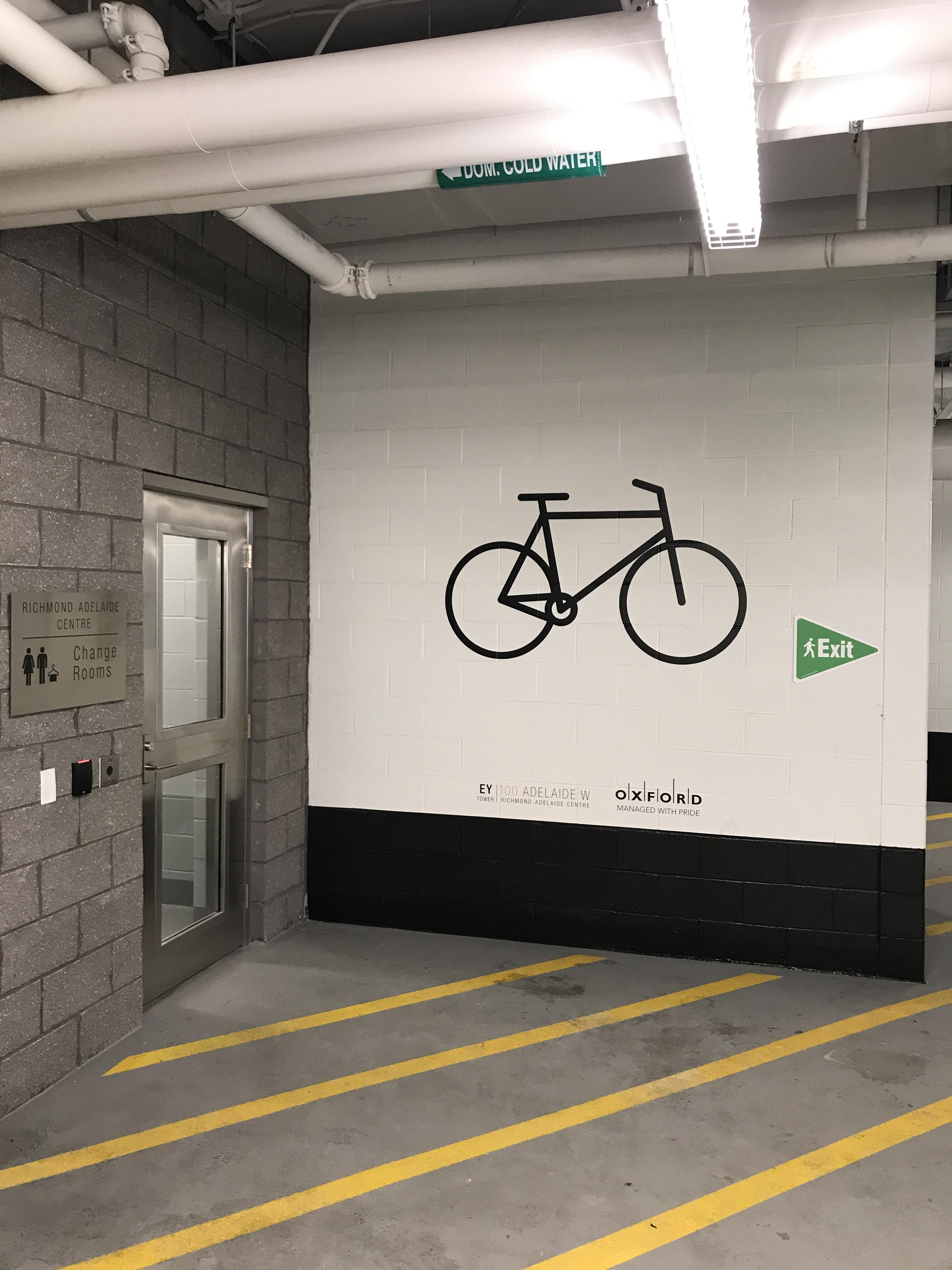 Trifold Creative was commissioned to completely transform the bicycle storage space at 100 Adelaide. We wanted to make the space impressive to tenants to encourage use of the space. There were a number of custom pieces created in order to achieve that, such as custom 3D lettering, vintage bicycle wheels, and bicycle lane graphics on the floor, along with large wall wraps as well as unique frames. The style here was to be old vs new. The old, or vintage aspect was achieved through photography seen in the gallery walls in the washrooms, the bicycle photos throughout the space, and the large vintage map of Toronto. The new, or modern aspect was through the graphic elements, seen in the typography choice as well as the geometric designs on the map wall as well as juxtaposed with the vintage photos of the bicycles.