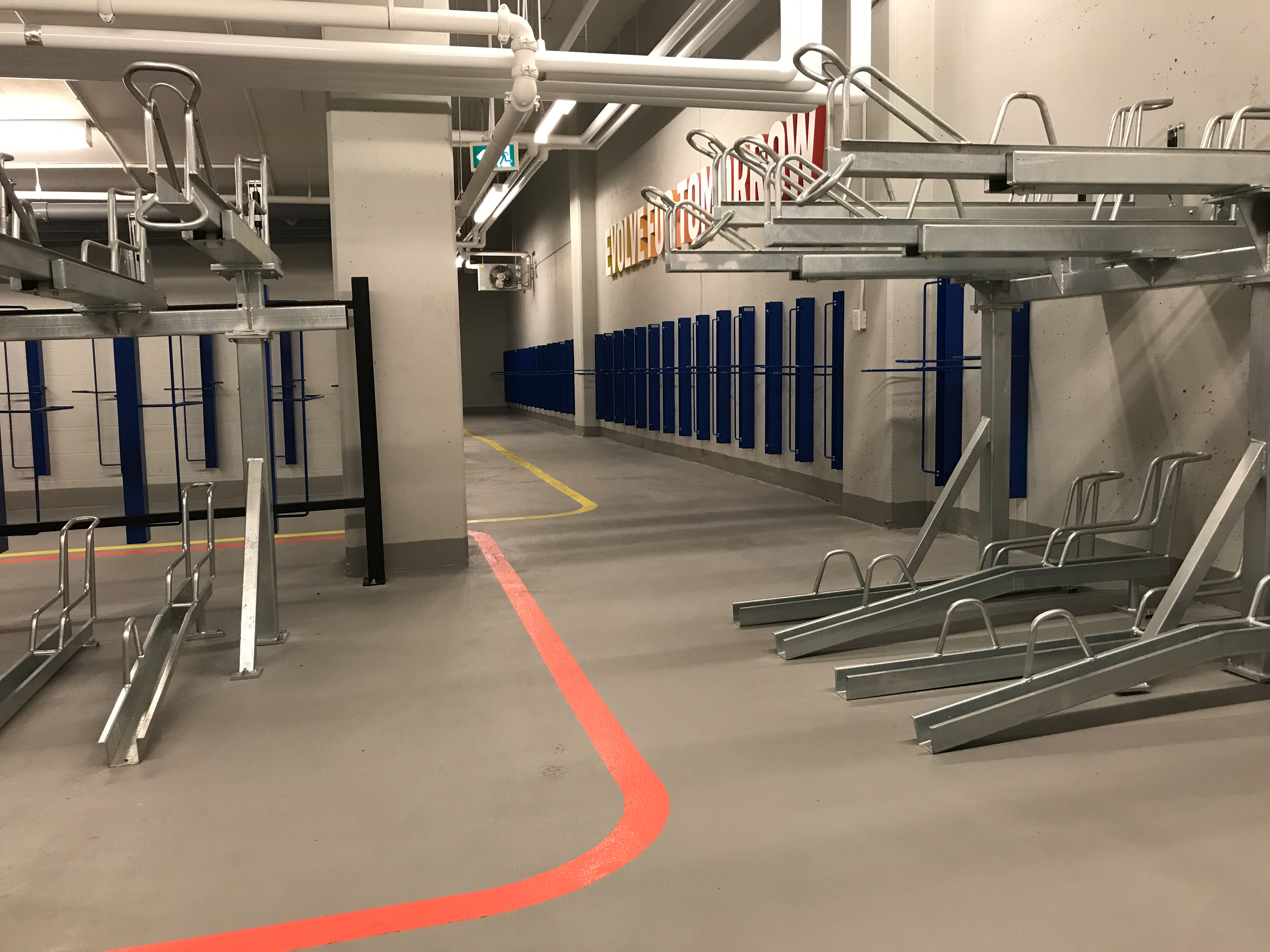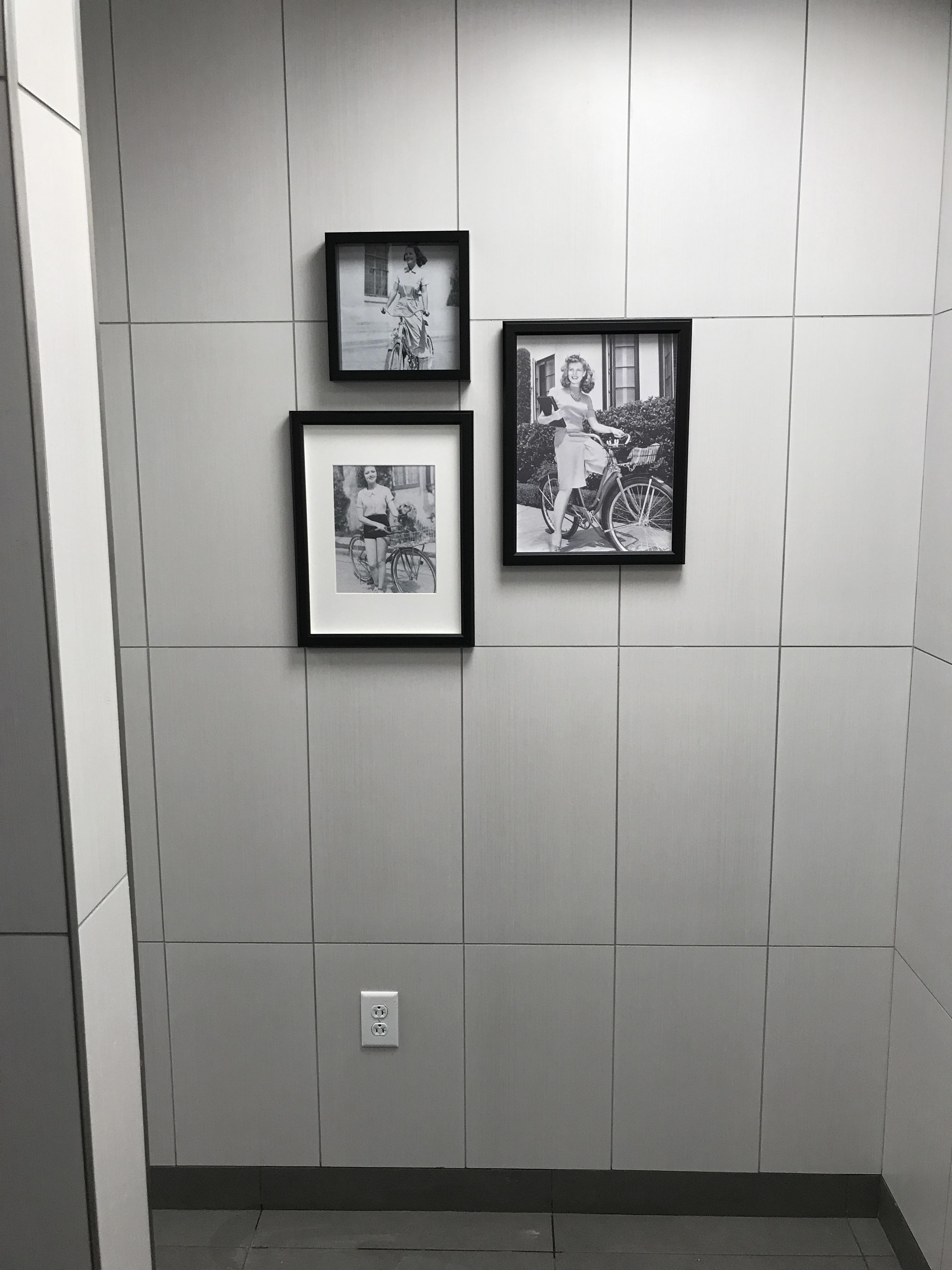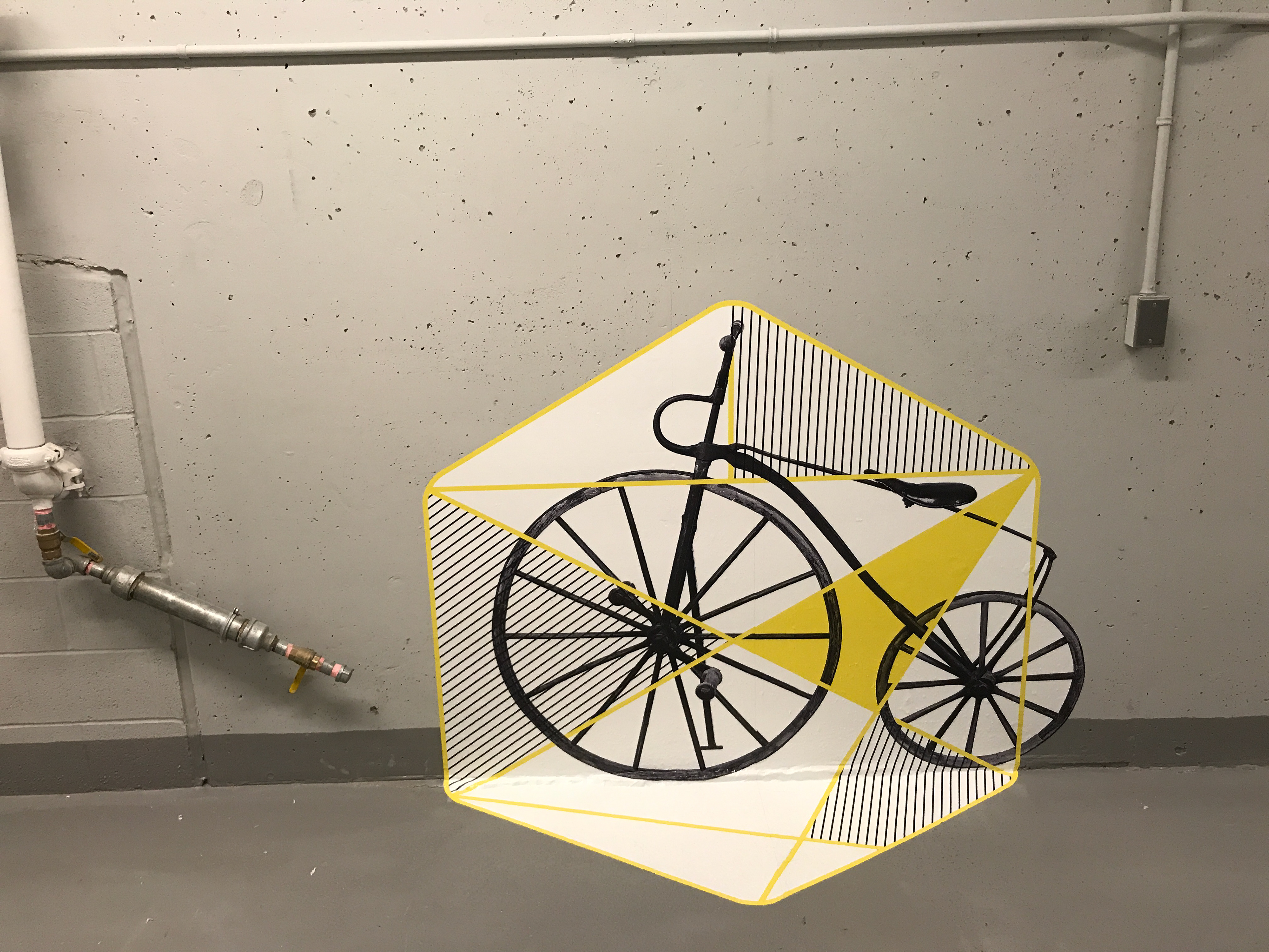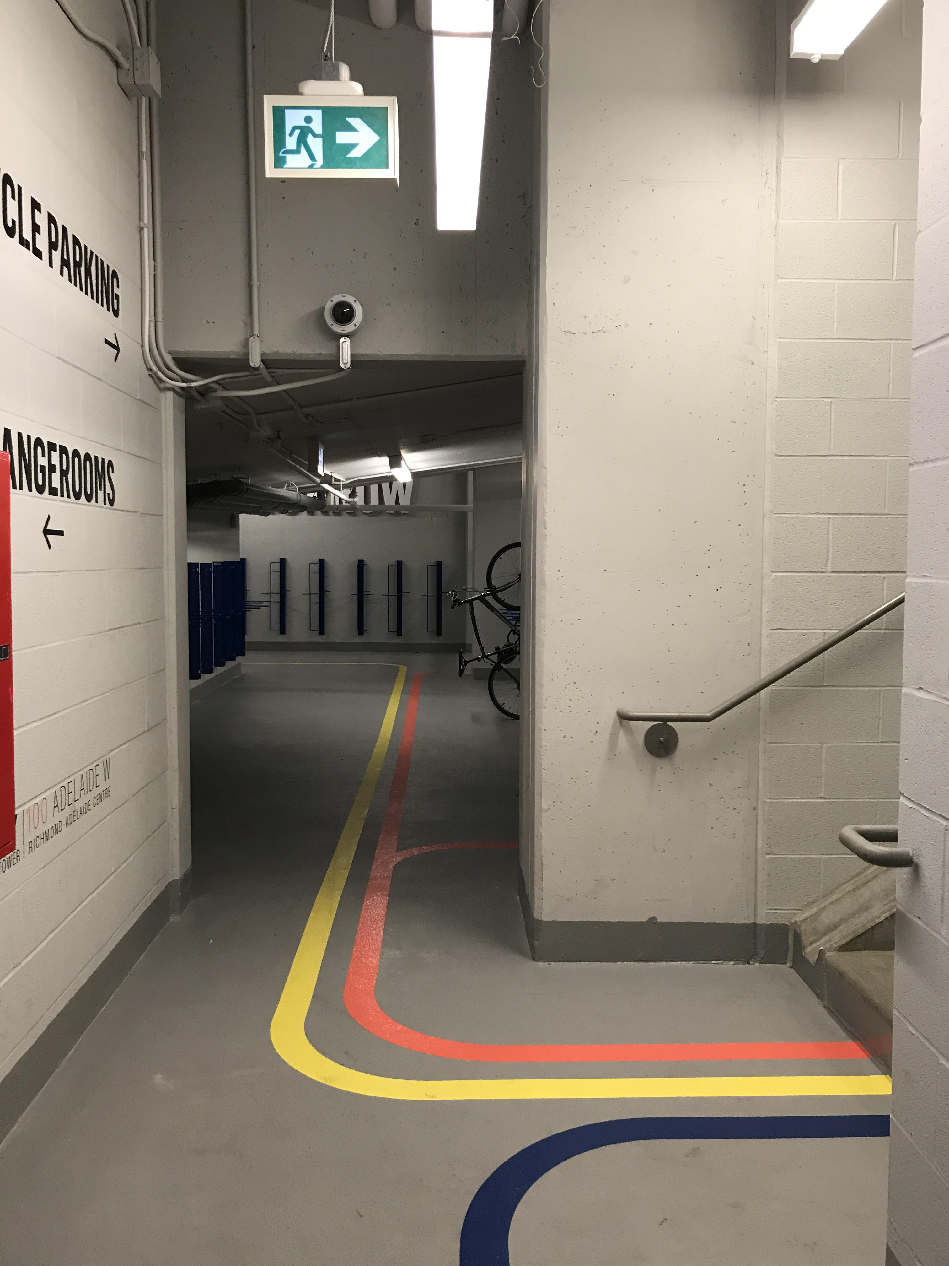 Trifold Creative was commissioned to completely transform the bicycle storage space at 100 Adelaide. We wanted to make the space impressive to tenants to encourage use of the space. There were a number of custom pieces created in order to achieve that, such as custom 3D lettering, vintage bicycle wheels, and bicycle lane graphics on the floor, along with large wall wraps as well as unique frames. The style here was to be old vs new. The old, or vintage aspect was achieved through photography seen in the gallery walls in the washrooms, the bicycle photos throughout the space, and the large vintage map of Toronto. The new, or modern aspect was through the graphic elements, seen in the typography choice as well as the geometric designs on the map wall as well as juxtaposed with the vintage photos of the bicycles.