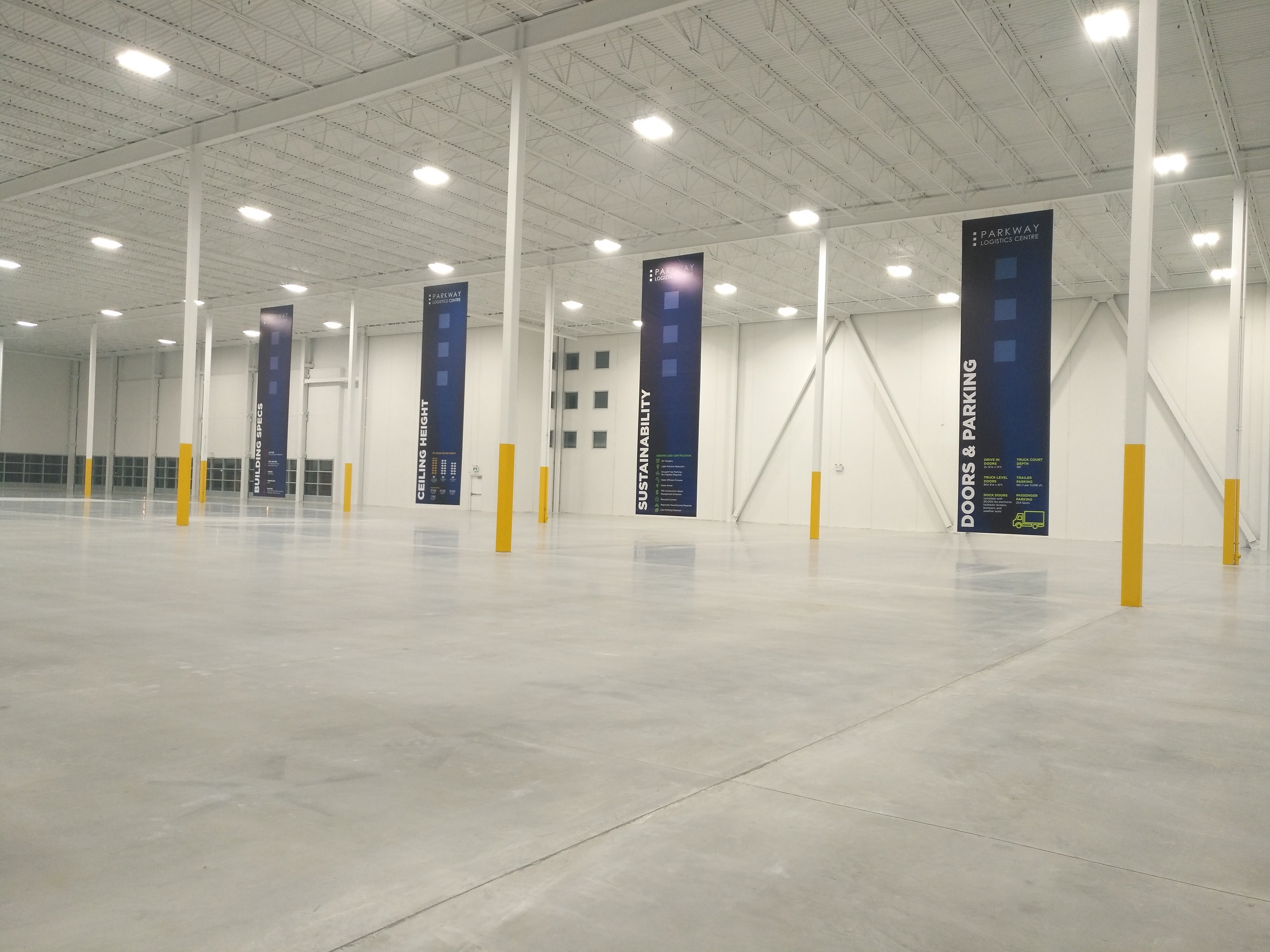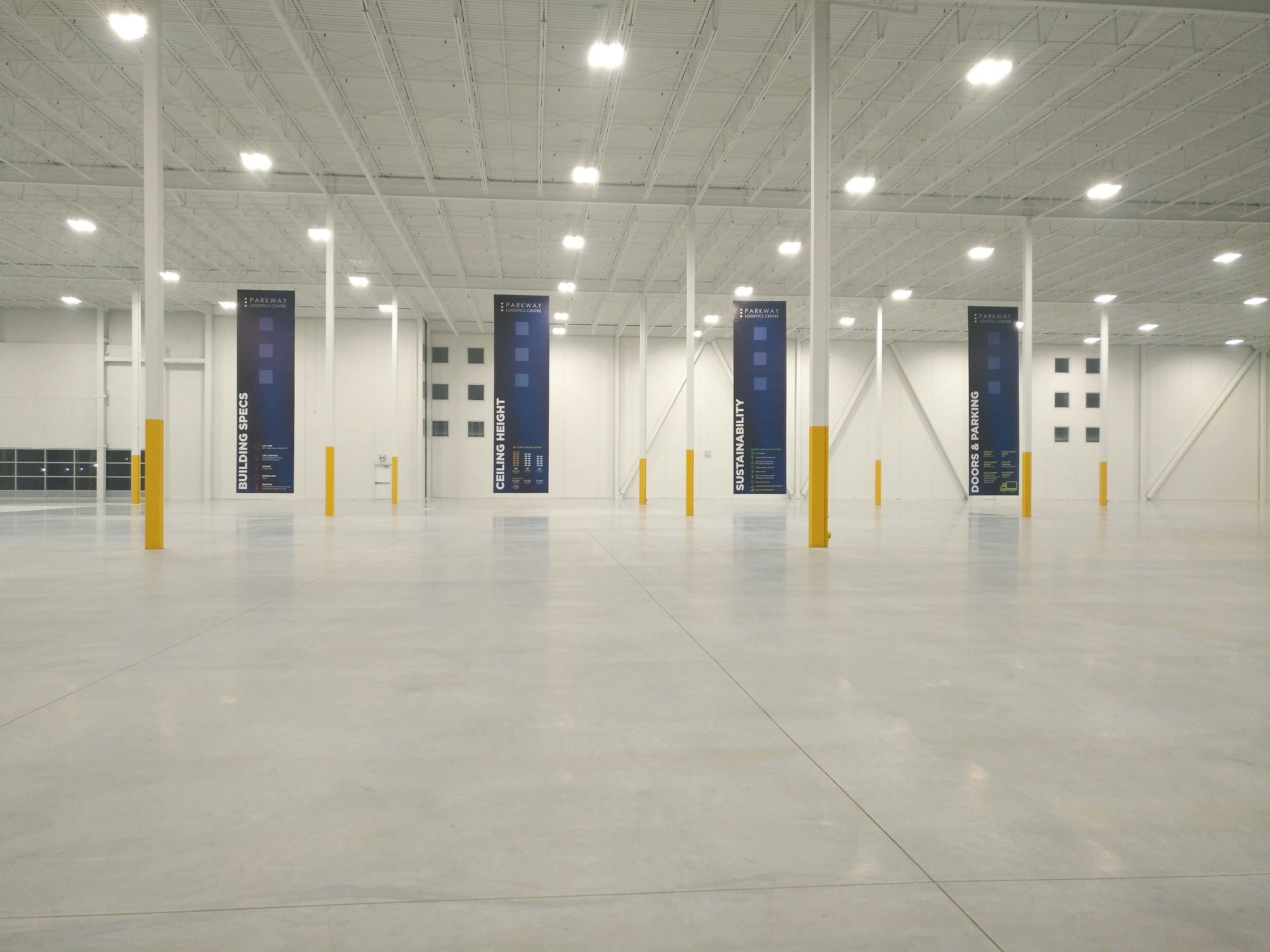A Broker tour experience was designed, printed, fabricated, and installed by Trifold. The goal was to create an interesting and visually appealing way to get the brokers to walk around the entire space, while informing them about the building. Trifold created custom 10'w x 34'h hanging banners that were stretched around a wooden frame for stability. We also created floor decals and installed them in various spots throughout the space in order to direct the tour.
