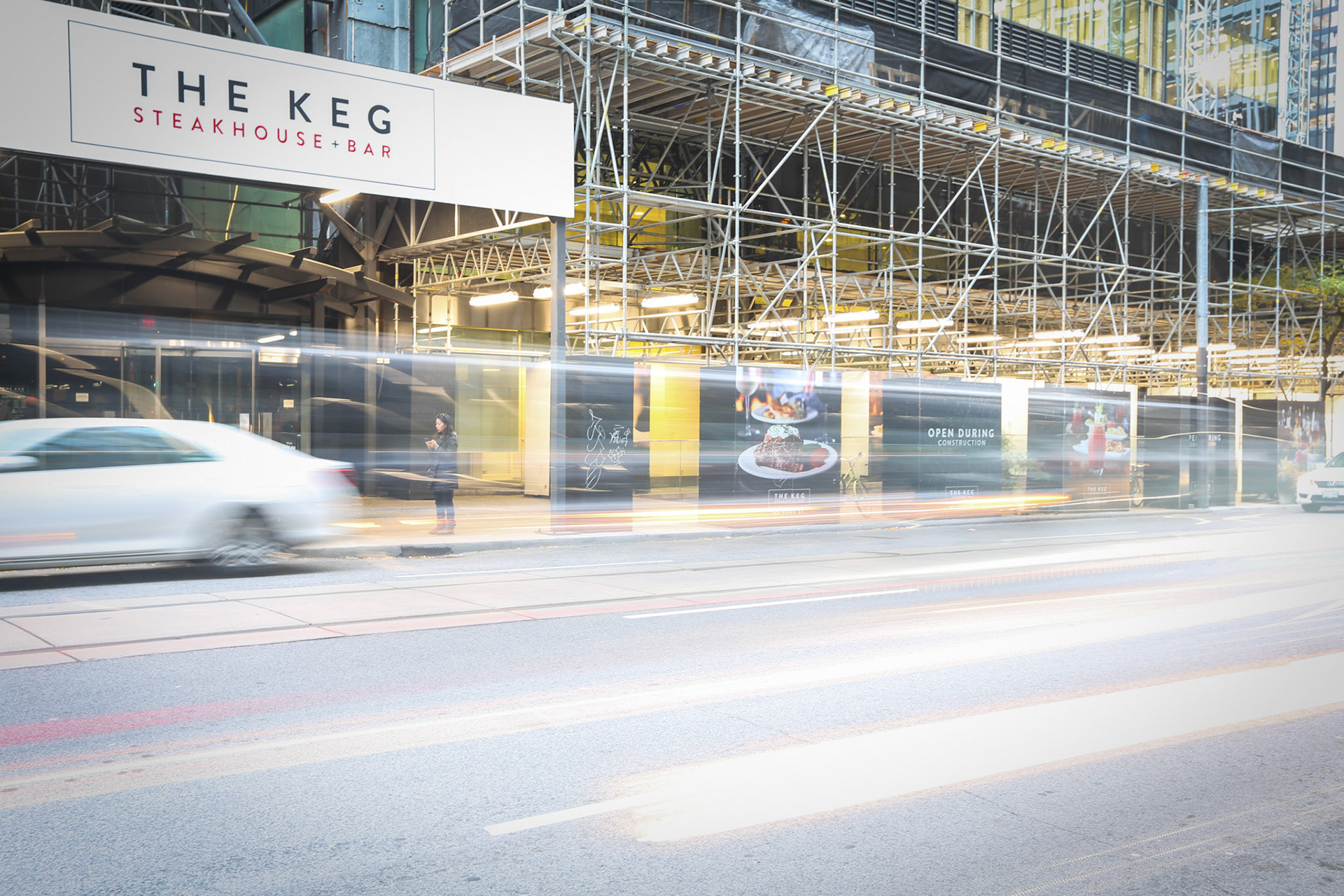 Due to the renovations going on at Richmond-Adelaide Centre, there was construction scaffolding throughout the patio and entrance at The Keg York Street. In the patio area, Trifold designed, printed, and installed large banners to cover up the construction scaffolding. The banners were designed to look like a forest, so guests would feel like they were in nature, rather than a construction site. The total coverage was over 5,000 square feet of mesh banners. Trifold also designed, custom fabricated, printed, and installed a large alupanel sign outside the entrance area, along with installing alupanal hoarding graphics around the scaffolding on York Street.